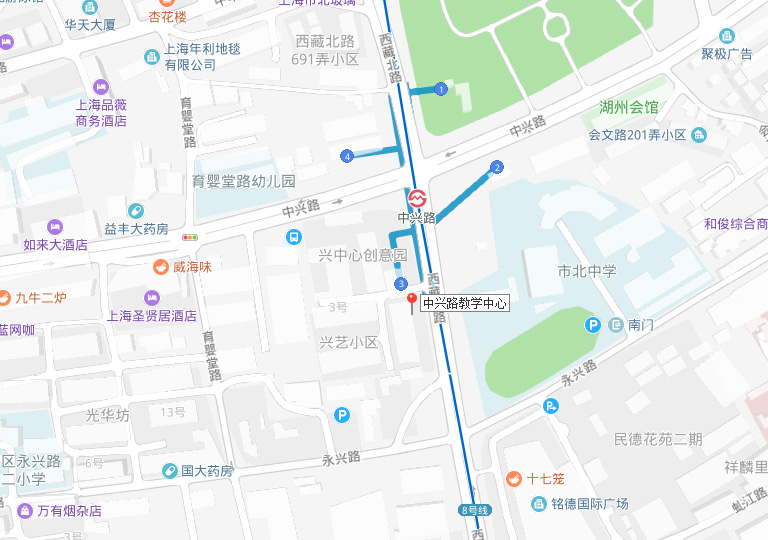 中兴路教学中心位于静安区,8号线中兴路站3号出口。该中心设施齐全,配备投影仪、互动白板、实物展台、监控等,教室可满足从9人至22人不同规模的上课需求。